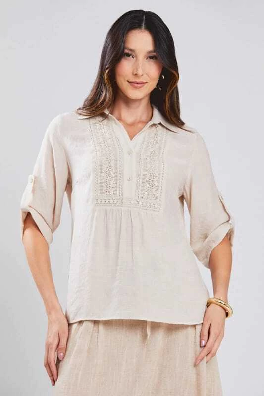 BLUSA CAMISA EM VISCOSE C/ PALA RENDA E MG C/ ALHETA