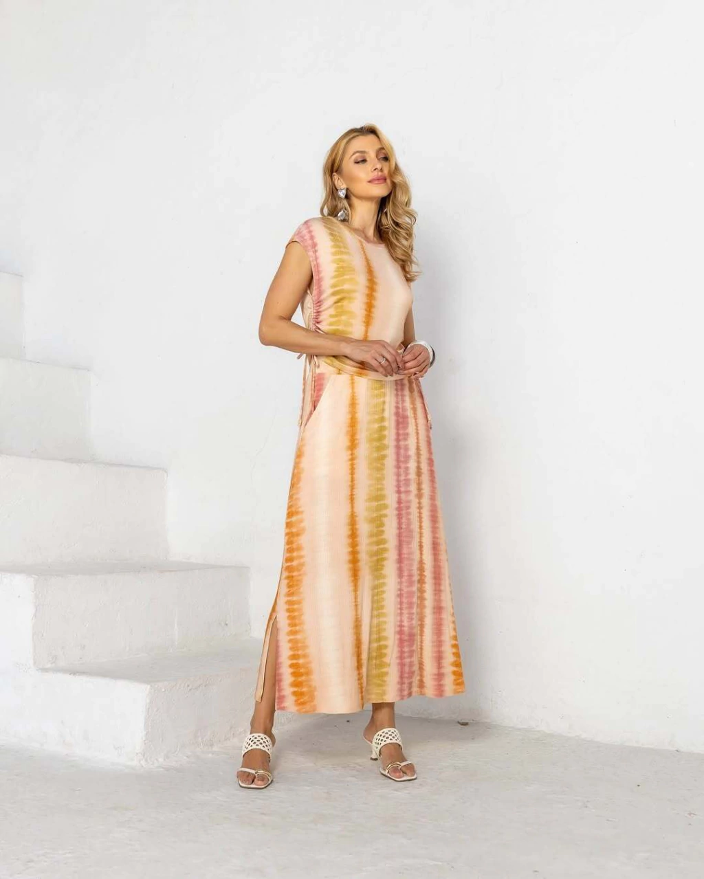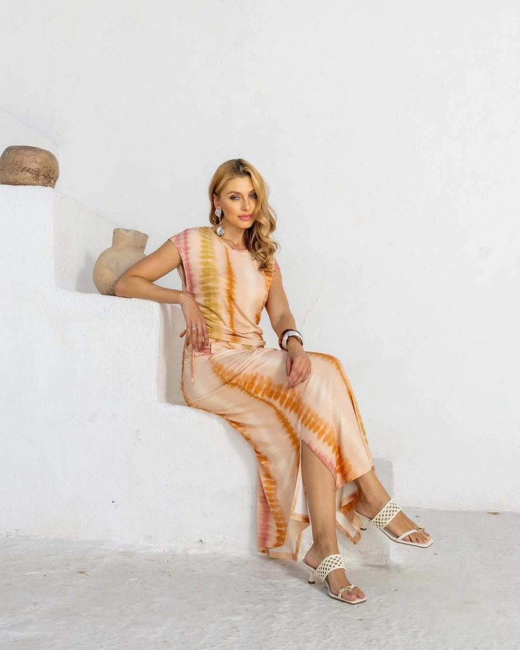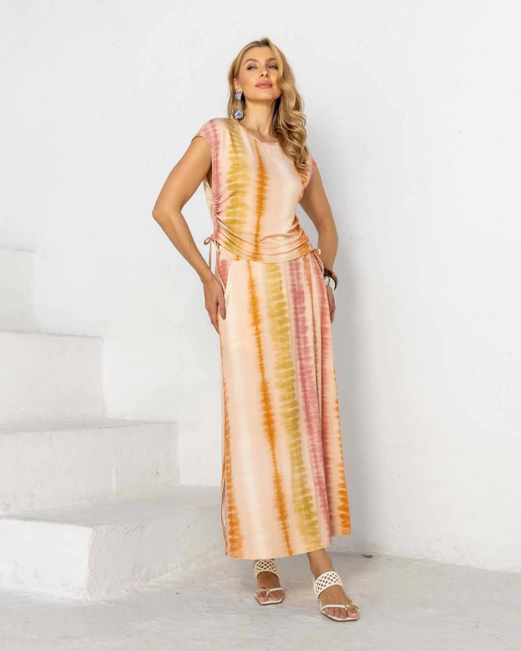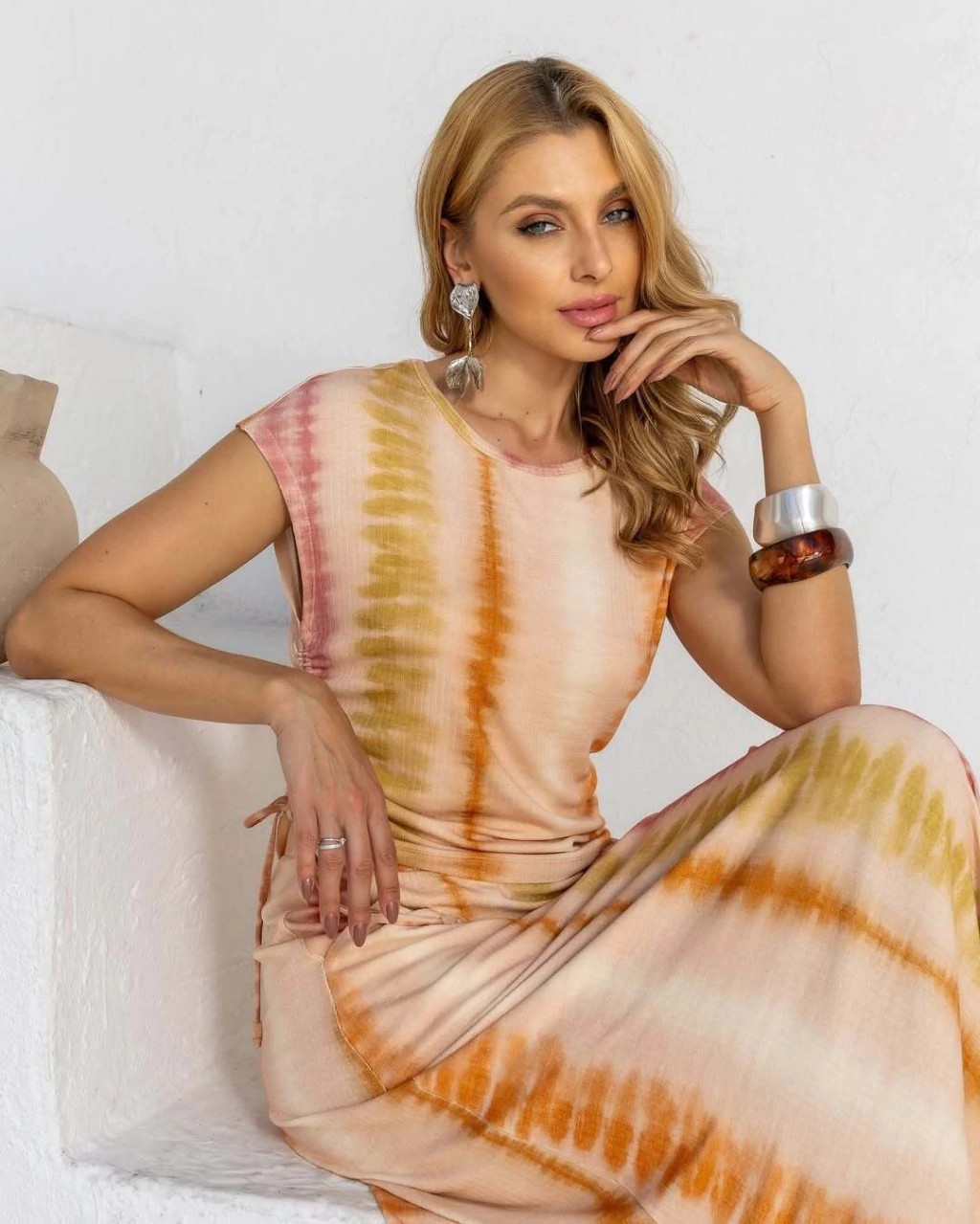 A regata com franzido lateral valoriza a silhueta com um toque delicado, enquanto a saia longa traz aquele movimento fluido e elegante, perfeito para looks leves e descontraídos. O efeito tie dye confere uma vibe moderna e cheia de personalidade, ideal para quem ama estar na moda sem abrir mão do conforto.
